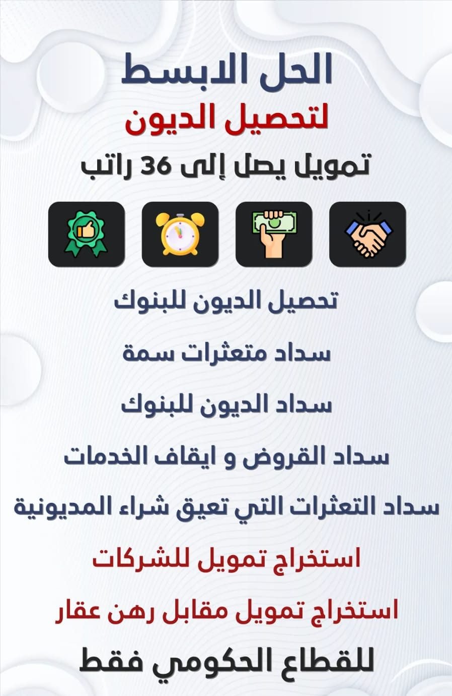 | تسديد قروض شمال الرياض | خصم 30% عند طلب خدمة |